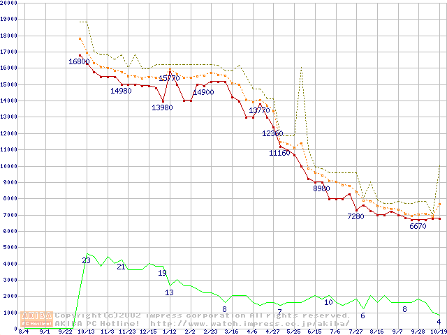 Socket A (OPGA,FSB 266MHz,L2 256KB,Palomino)の最安値推移