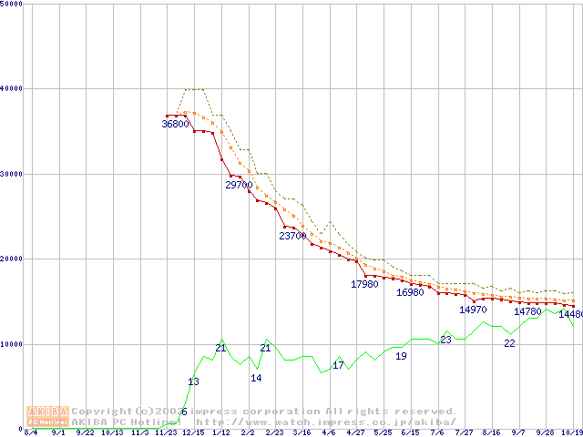 Travelstar 40GN (9.5mm,4200rpm,UltraATA/100,2MB,FDB,20GB/Platter)の最安値推移