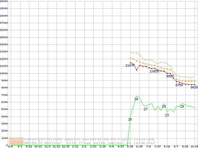 Socket 370 (FC-PGA2,FSB 100MHz,L2 256KB,Tualatin)の最安値推移