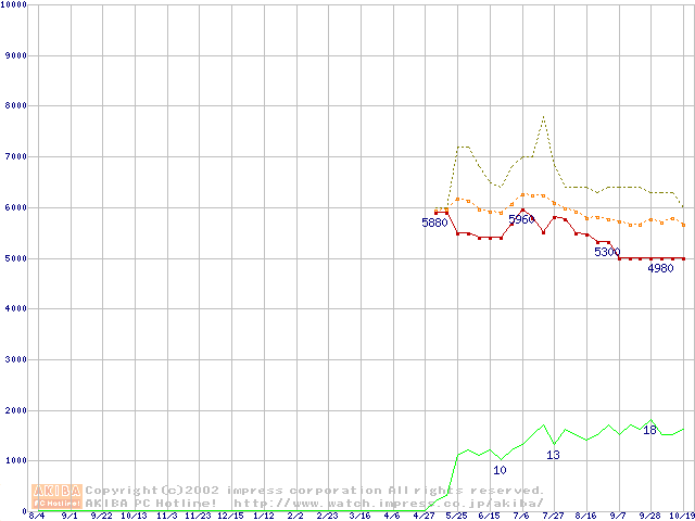 メモリ主要製品(最安値5千円未満)の最安値推移