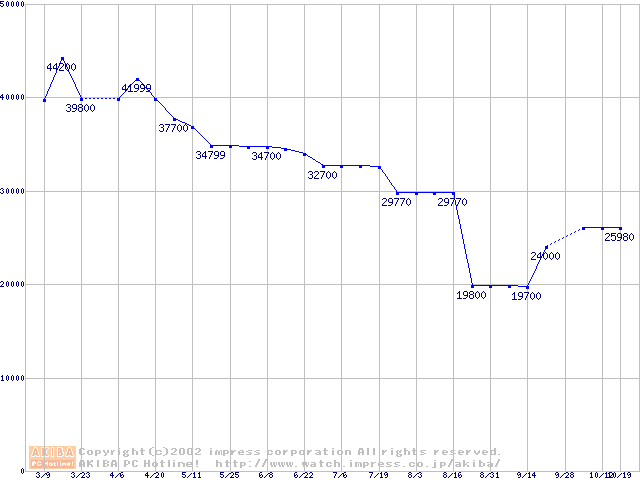 | [↑前グラフ]: | Travelstar 60GH (12.5mm,5400rpm,UltraATA/100,2MB,FDB,15GB/Platter)の最安値推移 |