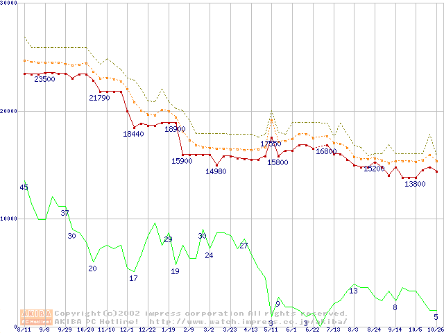 Socket 370 (FC-PGA,FSB 133MHz,L2 256KB)の最安値推移