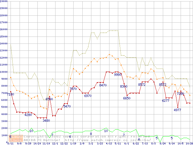 PC100 SDRAM DIMM CasLatency=2 ECC対応の最安値推移