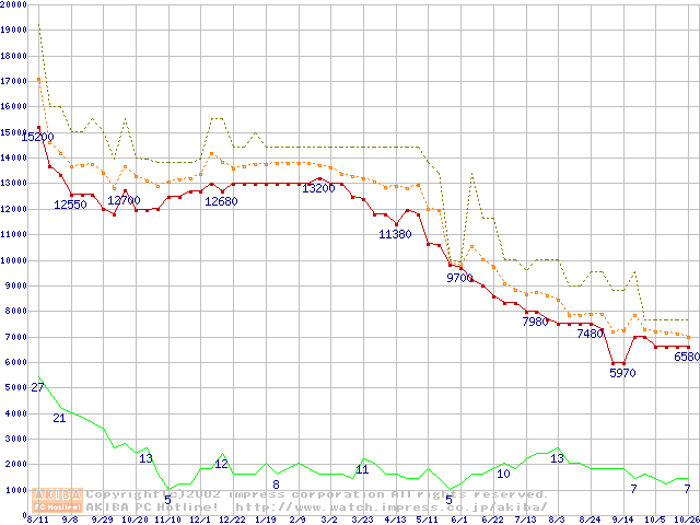 Socket A (PGA,FSB 266MHz,L2 256KB,Thunderbird)の最安値推移