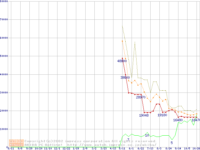 メモリ主要製品(最安値1万円以上)の最安値推移