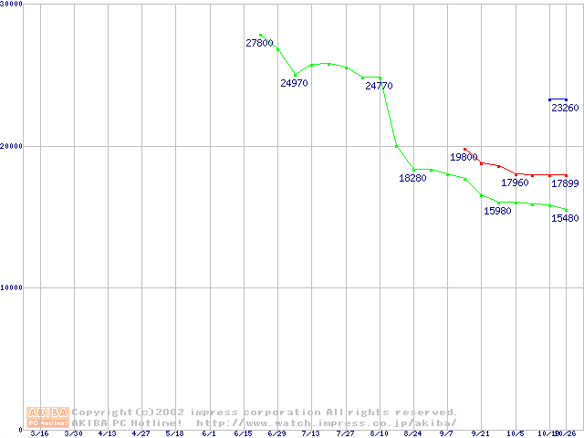| Socket A (OPGA,FSB 266MHz,L2 256KB,Thoroughbred)の最安値推移 |