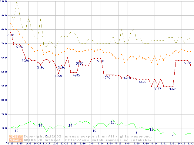 PC800-45 DRDRAM RIMM ECC対応の最安値推移