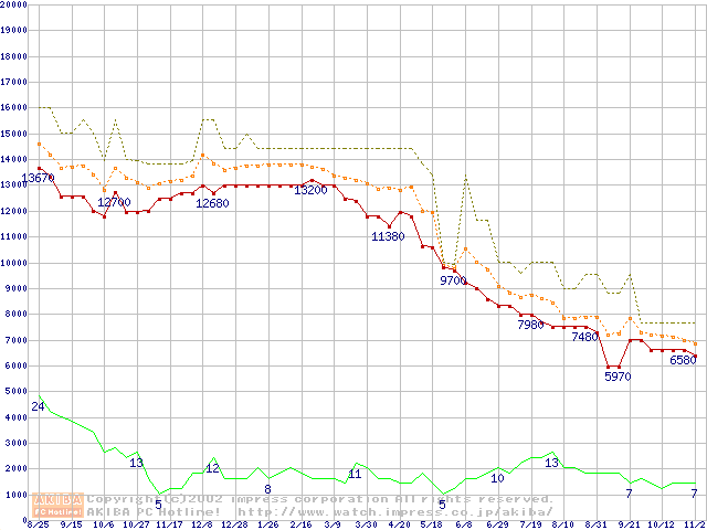 Socket A (PGA,FSB 266MHz,L2 256KB,Thunderbird)の最安値推移