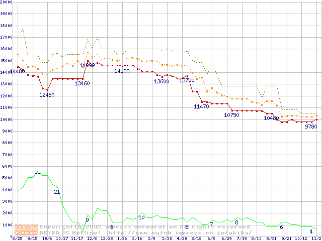 Socket A (PGA,FSB 266MHz,L2 256KB,Thunderbird)の最安値推移