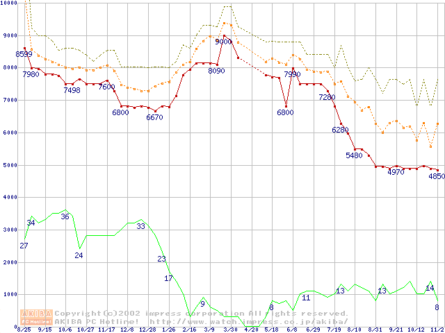 Socket 370 (FC-PGA,FSB 100MHz,L2 128KB,Coppermine)の最安値推移