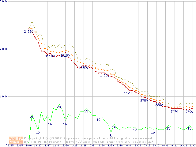 Socket A (OPGA,FSB 266MHz,L2 256KB,Palomino)の最安値推移