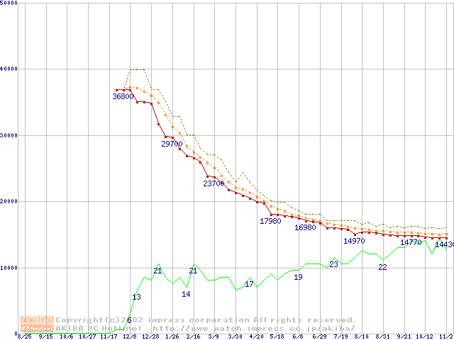 Travelstar 40GN (9.5mm,4200rpm,UltraATA/100,2MB,FDB,20GB/Platter)の最安値推移
