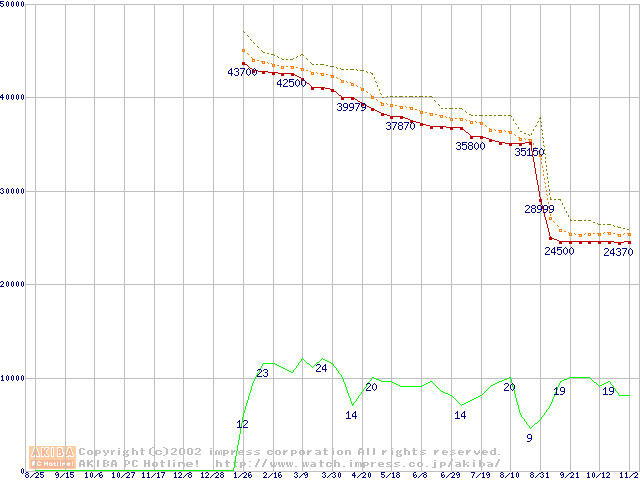 Socket 370 (FC-PGA2,FSB 133MHz,L2 512KB)の最安値推移