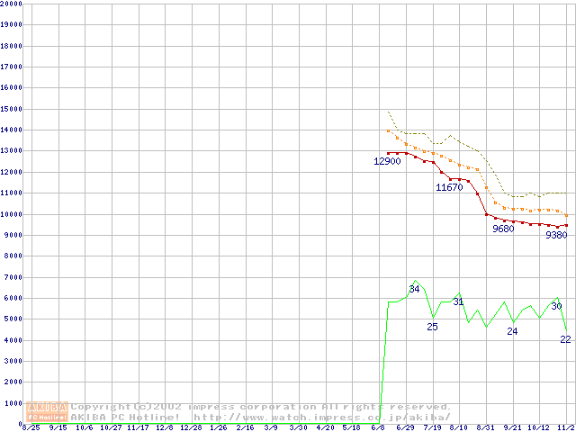 Socket 478 (micro-PGA,FSB 400MHz,L2 128KB,Willamette)の最安値推移