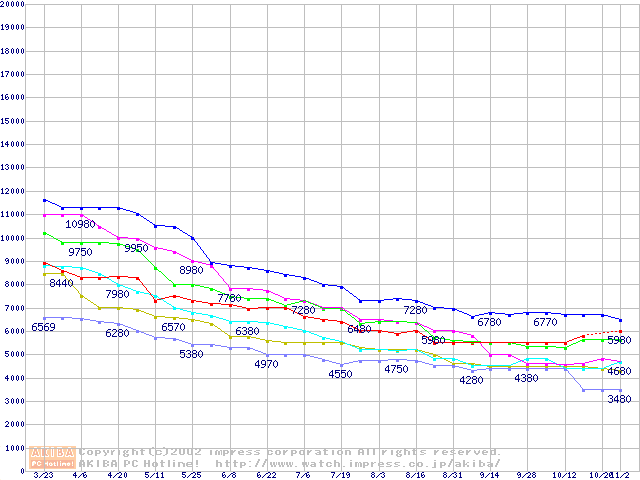 | [↑前グラフ]: | Socket A (PGA,FSB 200MHz,L2 256KB,Thunderbird)の最安値推移 |