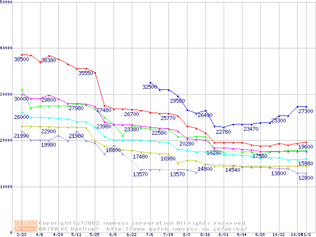 | [↑前グラフ]: | Socket A (OPGA,FSB 266MHz,L2 256KB,Thoroughbred)の最安値推移 |