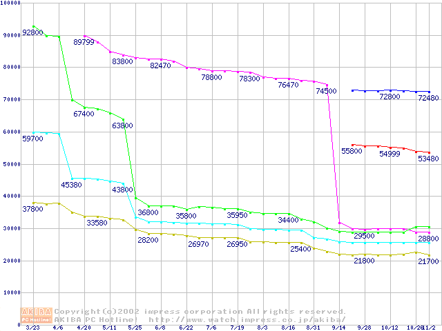 | [↑前グラフ]: | Socket 478 (micro-PGA,FSB 400MHz,L2 512KB,Northwood)の最安値推移 |
