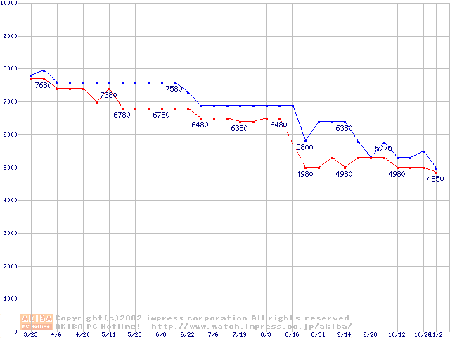 | [↓次グラフ]: | Deskstar 180GXP (7200rpm,8MB,UltraATA/100,FDB)の最安値推移 |