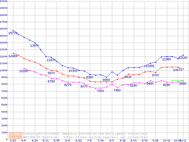 | [↑前グラフ]: | Deskstar 180GXP (7200rpm,2MB,UltraATA/100,FDB)の最安値推移 |
