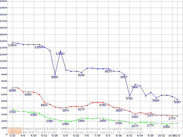 | [↓次グラフ]: | PC100 SDRAM DIMM CasLatency=2 ECC対応の最安値推移 |