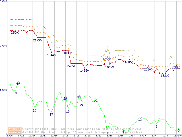 Socket 370 (FC-PGA,FSB 133MHz,L2 256KB)の最安値推移