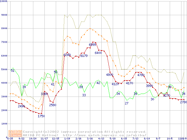 PC100 SDRAM DIMM CasLatency=2の最安値推移
