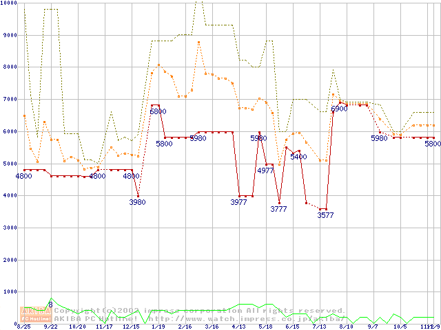 PC133 SDRAM DIMM CasLatency=3 ECC対応 Registeredタイプの最安値推移