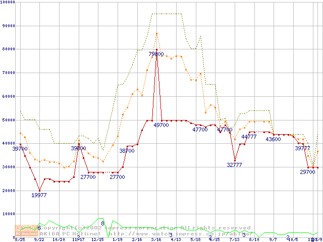 PC133 SDRAM DIMM CasLatency=3 ECC対応 Registeredタイプの最安値推移