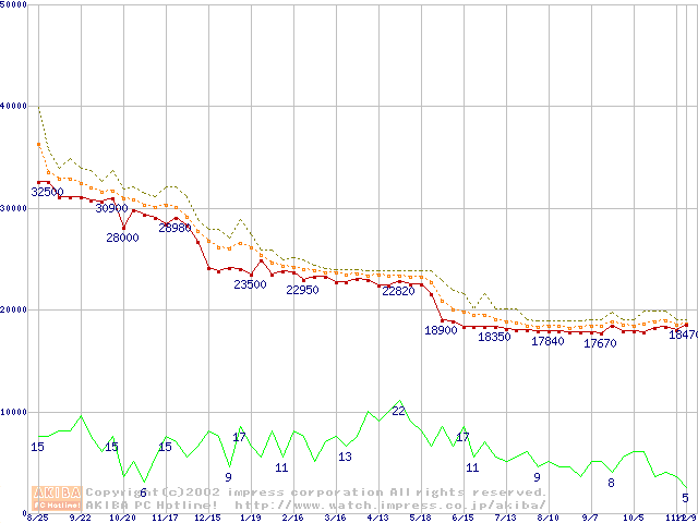 Socket 370 (FC-PGA2,FSB 133MHz,L2 512KB)の最安値推移