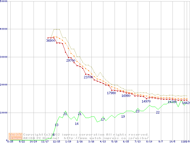 Travelstar 40GN (9.5mm,4200rpm,UltraATA/100,2MB,FDB,20GB/Platter)の最安値推移