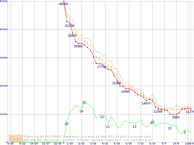 Socket A (OPGA,FSB 266MHz,L2 256KB,Palomino)の最安値推移