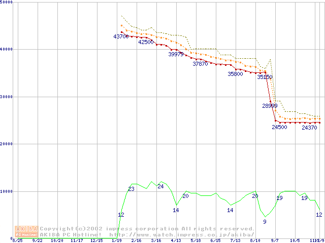 Socket 370 (FC-PGA2,FSB 133MHz,L2 512KB)の最安値推移