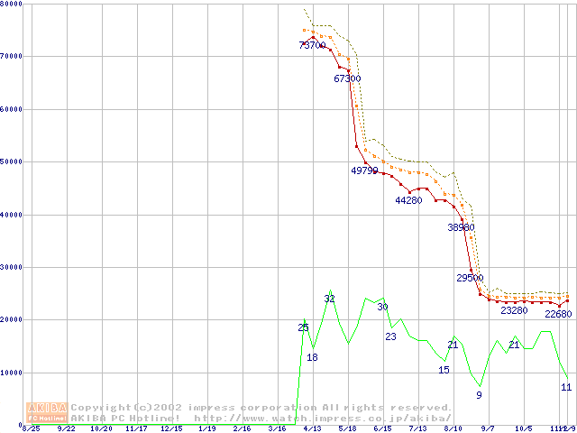 Socket 478 (micro-PGA,FSB 400MHz,L2 512KB,Northwood)の最安値推移
