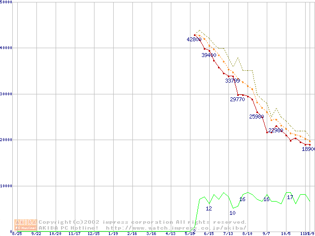 Travelstar 40GNX (9.5mm,5400rpm,UltraATA/100,8MB,FDB,20GB/Platter)の最安値推移