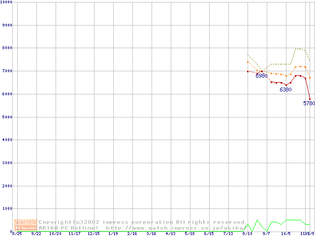 Socket 370 (FC-PGA,FSB 100MHz,L2 128KB,Coppermine)の最安値推移