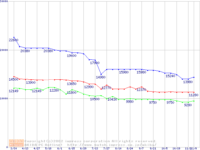 | [↑前グラフ]: | MHSシリーズ (9.5mm,4200rpm,UltraATA/100,2MB,FDB,30GB/Platter,FDB)の最安値推移 |