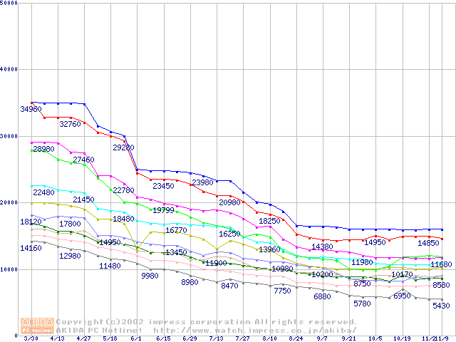 Socket A (OPGA,FSB 200MHz,L2 256KB)の最安値推移