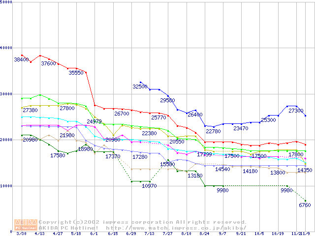 | [↑前グラフ]: | Socket A (OPGA,FSB 266MHz,L2 256KB,Thoroughbred)の最安値推移 |