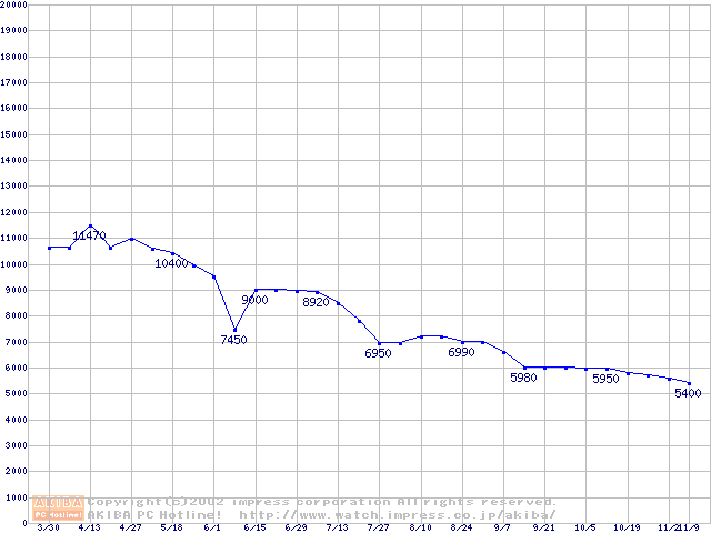 | Socket A (PGA,FSB 200MHz,L2 256KB,Thunderbird)の最安値推移 |