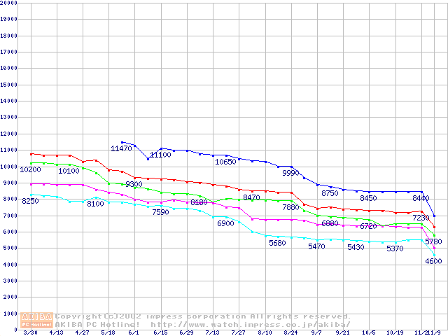 | [↑前グラフ]: | Socket 478 (micro-PGA,FSB 400MHz,L2 128KB,Willamette)の最安値推移 |