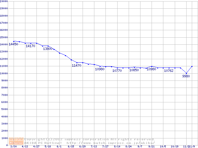 | [↑前グラフ]: | DiamondMax D540X-4G (5400rpm,UltraATA/133,40GB/Platter)の最安値推移 |