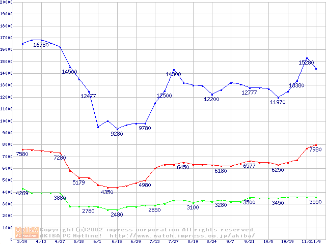 | [↓次グラフ]: | PC2700(DDR333) DDR SDRAM DIMMの最安値推移 |