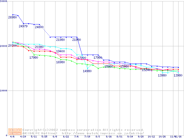 | [↑前グラフ]: | 2.5インチHDD 30GB~40GB未満(9.5mm厚)の最安値推移 |