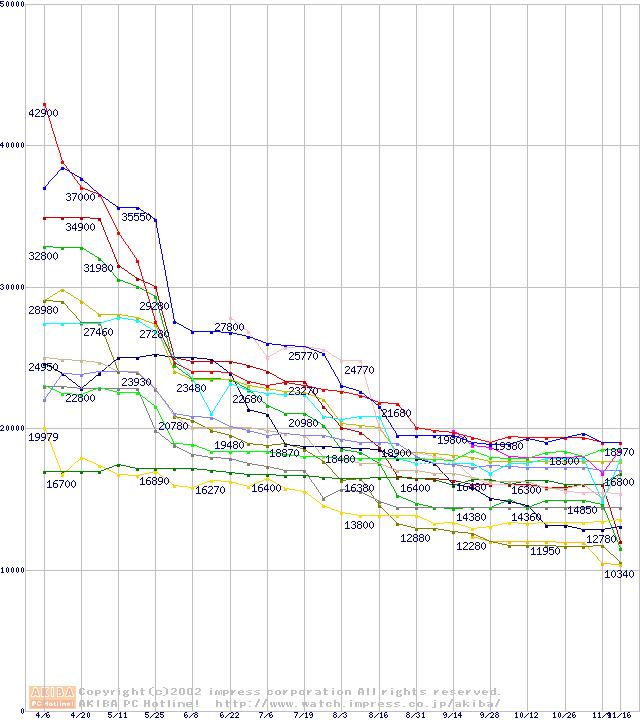 CPU主要製品(最安値1万円~2万円未満)の最安値推移