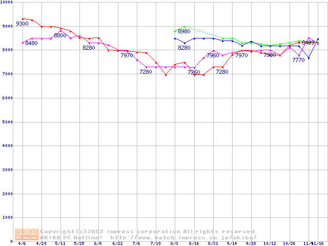 | [↓次グラフ]: | HDD 60GB~80GB未満(5400rpmクラス)の最安値推移 |