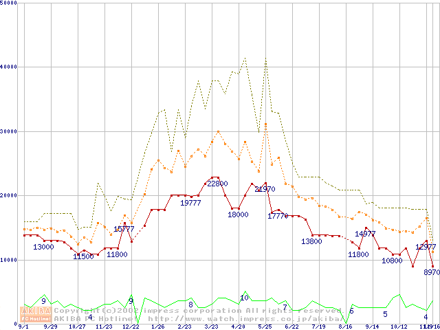 PC133 SDRAM DIMM CasLatency=3 ECC対応 Registeredタイプの最安値推移