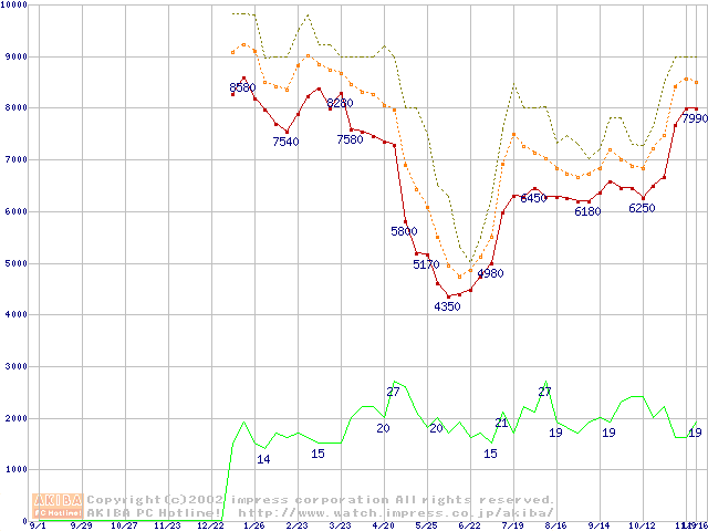メモリ主要製品(最安値5千円~1万円未満)の最安値推移