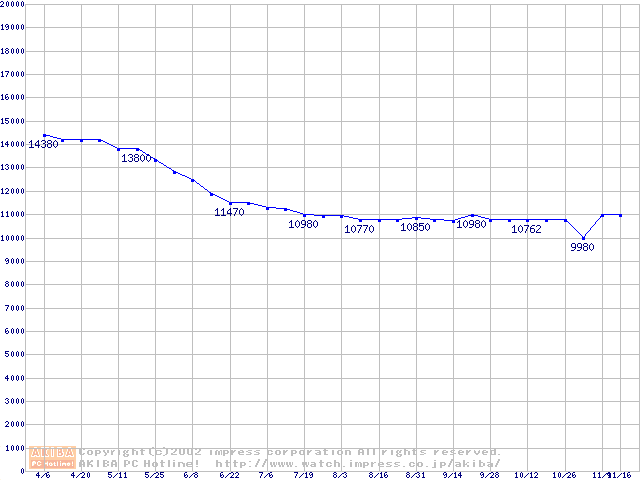 | [↑前グラフ]: | DiamondMax D540X-4G (5400rpm,UltraATA/133,40GB/Platter)の最安値推移 |