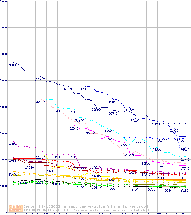 2.5インチHDD主要製品(最安値1万円未満)の最安値推移