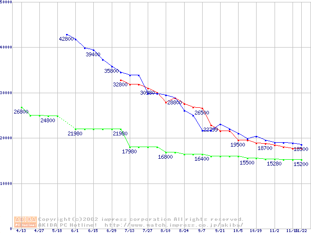 | [↓次グラフ]: | 2.5インチHDD主要製品(最安値2万円~3万円未満)の最安値推移 |